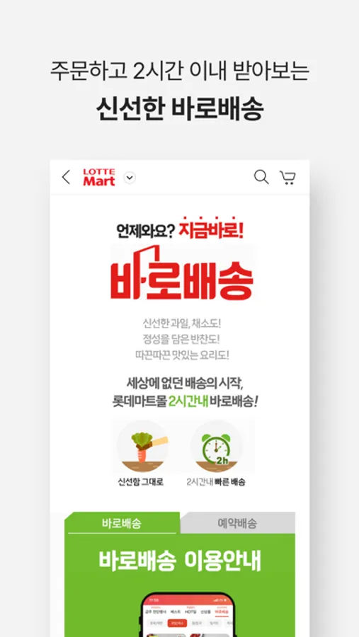 마트가 눈앞에 바로! 주문 후 2시간만 기다려주세요. 집 앞으로 바로 배송해드려요.