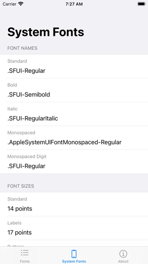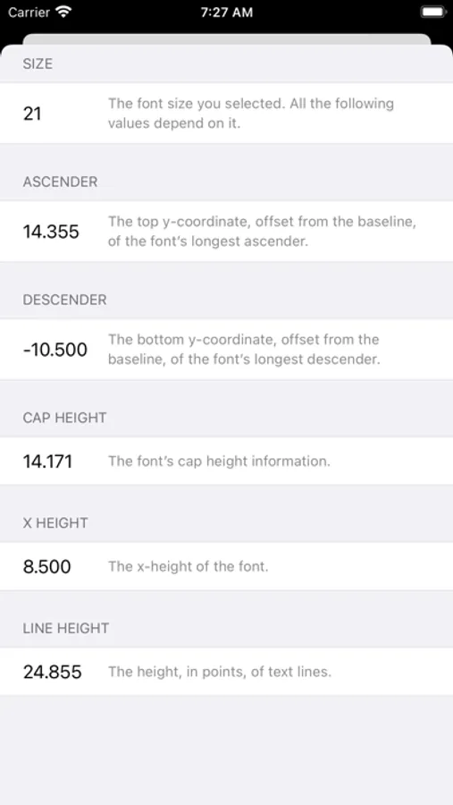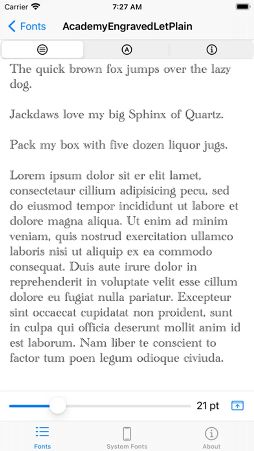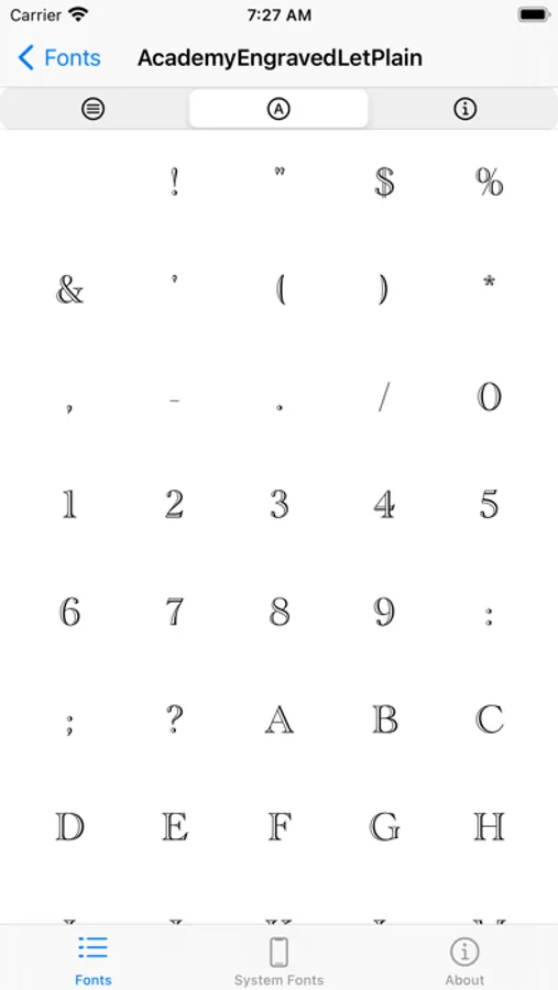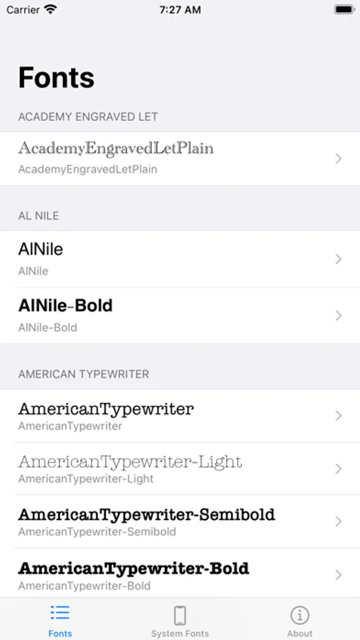 Font Browser lets you view all the font families and fonts available on your iPhone. This is especially useful if you are an iOS software developer or iOS app designer. Font Browser allows you to keep track of the ever-changing font families and fonts. Select any installed font and preview its appearance using editable sample text in multiple sizes.