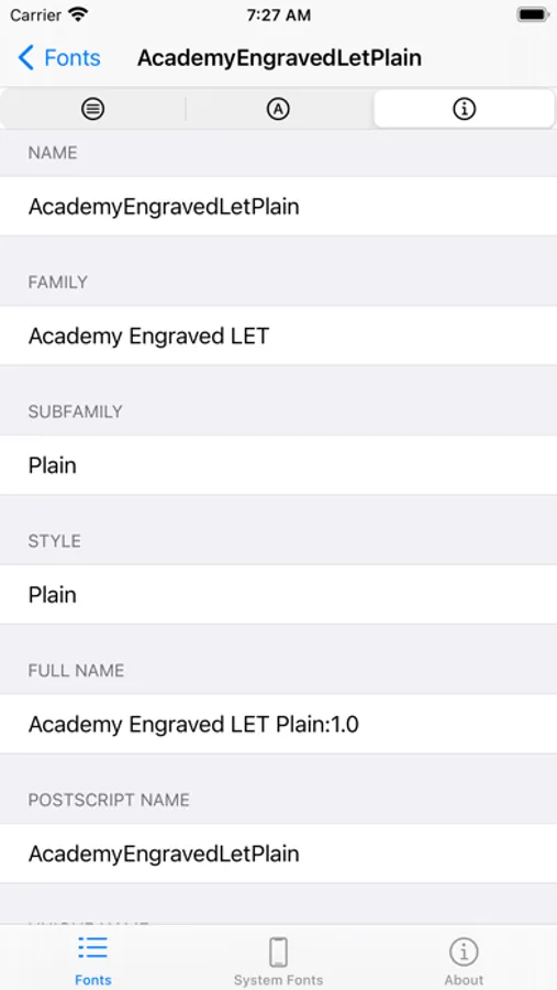 The app also displays additional information about the selected font like: Designer, Manufacturer, Copyright, Brand and much more.