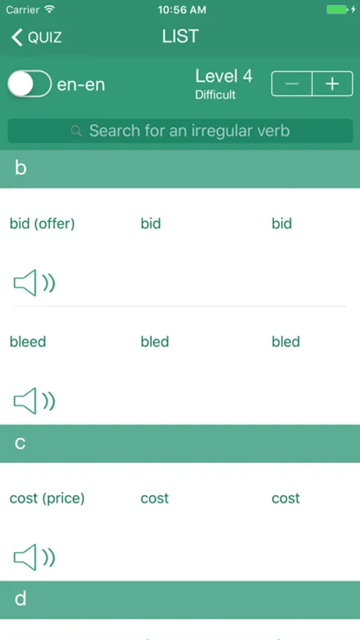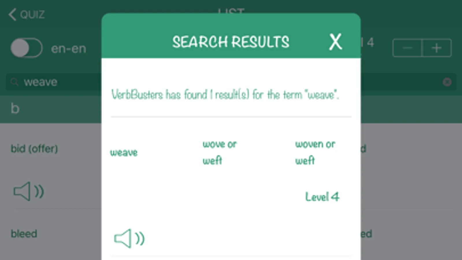 VerbBusters is a complete set of reference and practice materials for learning the English irregular verbs. It provides a quiz type activity on six levels of difficulty, bilingual verb lists and a searchable database of almost 180 verbs, with audio files to help with pronunciation. The application supports French, Spanish, German, Italian, Portuguese, Polish, Russian* and Chinese* and there is an English only mode for speakers of other languages.