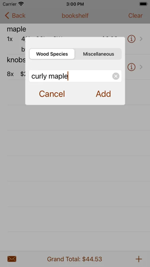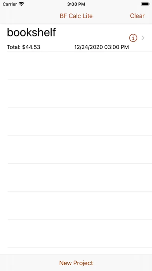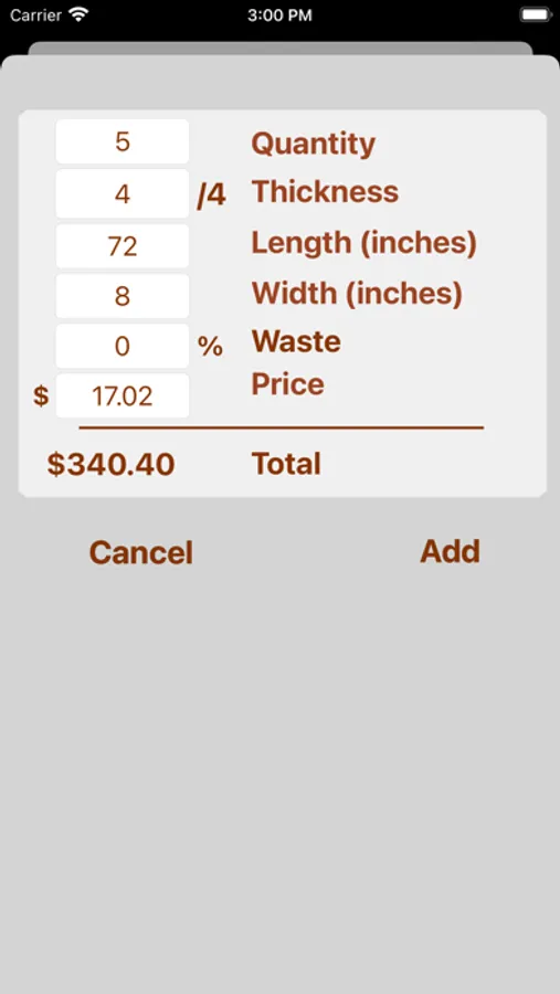 A simple boardfoot calculator with ability to save different sized and priced lumbers. Calculator has ability to include different items other than just the wood cost.