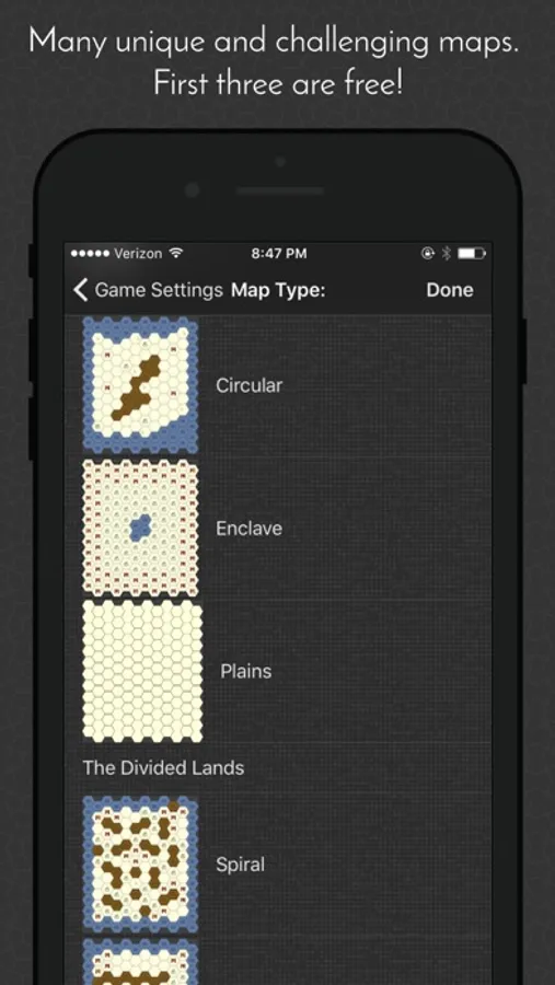 The free base game comes with three styles of maps in three sizes each. Additional map packs can be purchased for 99 cents. Purchase of any map pack removes advertisements.