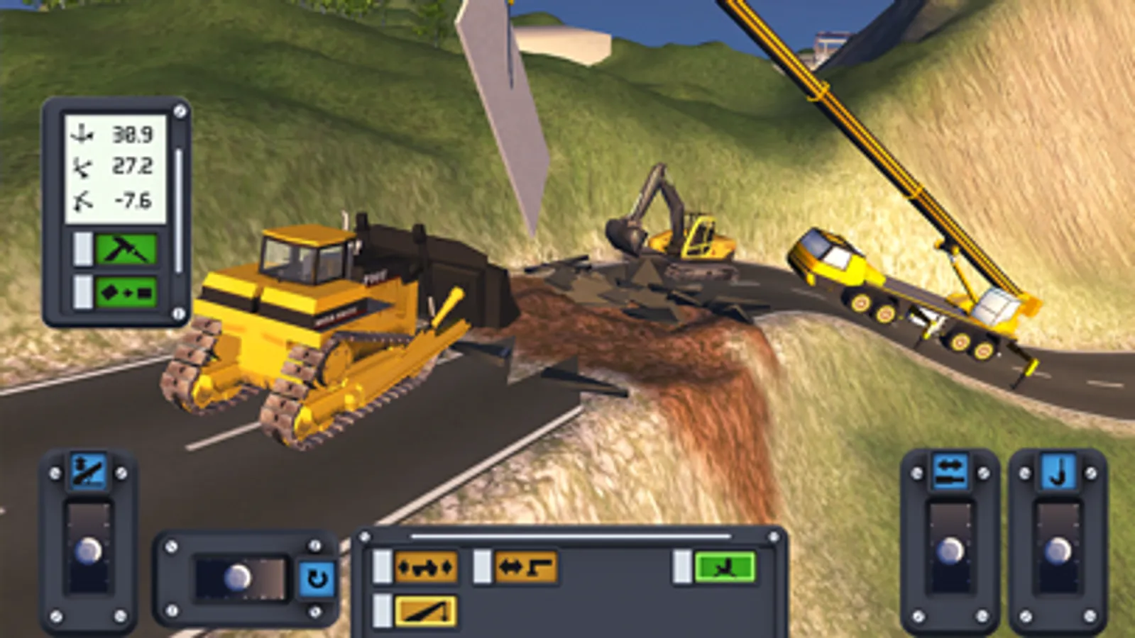 In Machine World your imagination is the limit. Build houses or other structures using the cranes and semi trailer. Dig anywhere with the excavator and the terrain will deform: create holes, trenches or hills. The roads are also destructible! There are lots of details in the world: An opening bridge with gates and signals, lots of props like cones and road blocks - strobe lights on vehicles and lots of objects to build with.
