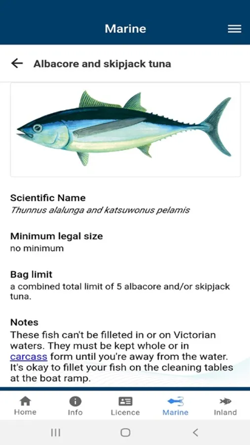 It describes size and bag limits, closed seasons and equipment restrictions. Other features include a direct link to purchase your fishing licence online, a licence outlet locator, connection to the 13FISH illegal fishing reporting line and a marine park/sanctuary boundary locator. This function uses the devices internal GPS to help fishers determine whether they are in or approaching a marine park or sanctuary.