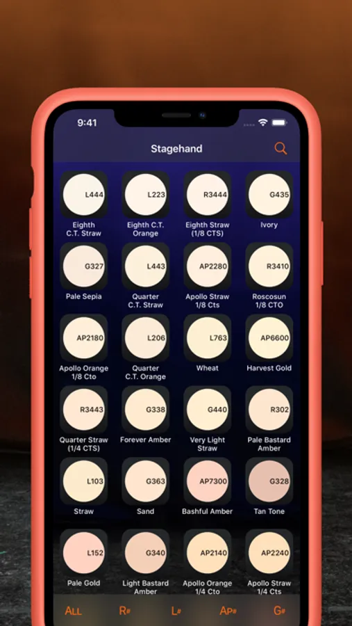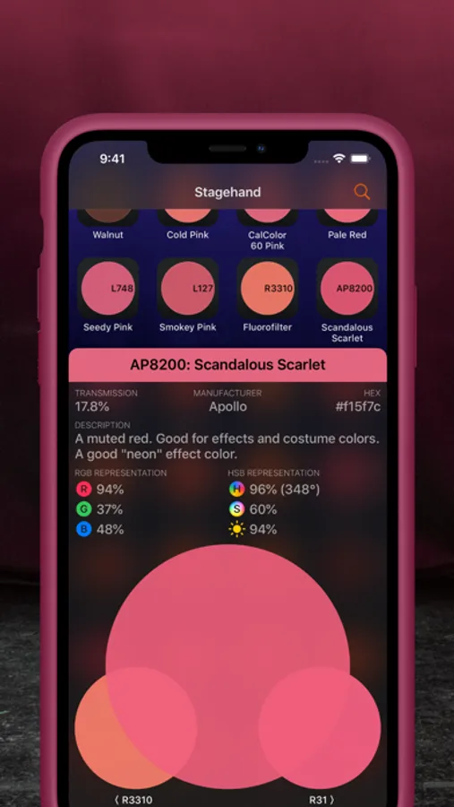 Stagehand brings the Roscolux, GAM, Lee and Apollo swatch books together on your iOS device! Gels are viewable by their swatch book, or all together sorted by hue, letting you find the perfect color without worrying about manufacturer. Each gel is complete with manufacturer information including transmission and description as well as samples of neighboring colors in the swatch book.