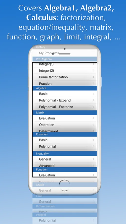 Math Solver covers problems at the level of Pre-Algebra, Algebra1, Algebra2, and Calculus courses: