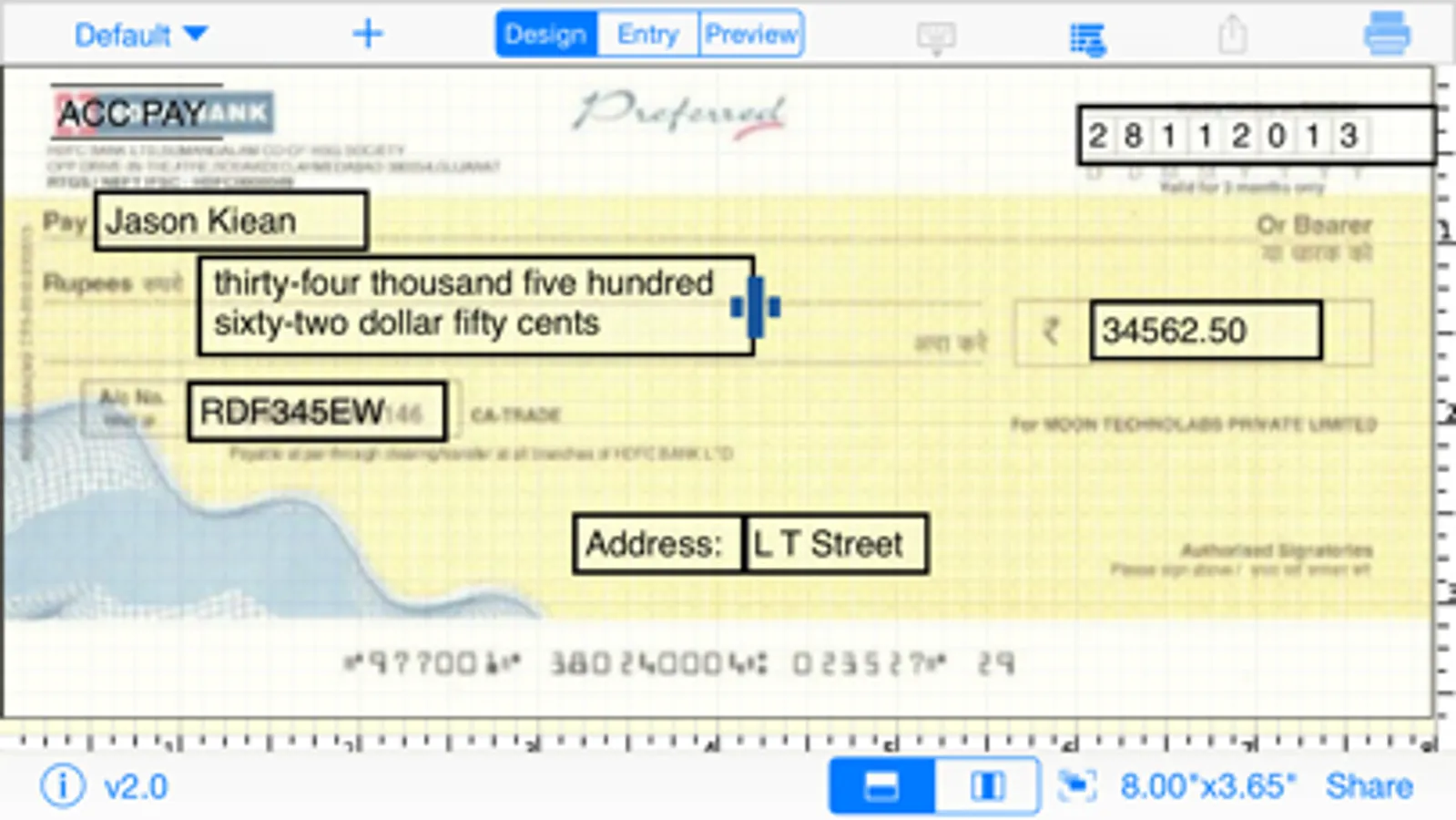 - Scanned Bank cheque image, then app will detect your cheque size and you can map/overlay fields over cheque image