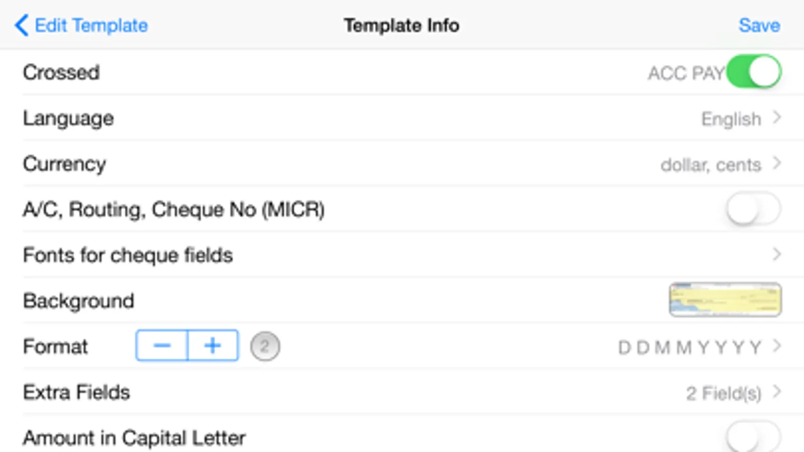 - App allows to add unlimited custom fields (label/textedit) to make cheque template as per your bank cheque needs like name, bank name, address, cheque no# etc