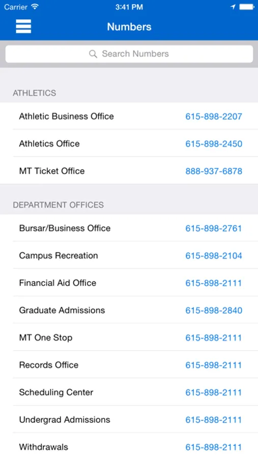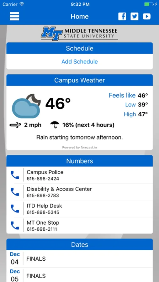 - Alerts -- view current MTSU alerts on the home screen, with the option to view detailed information in the alerts feature