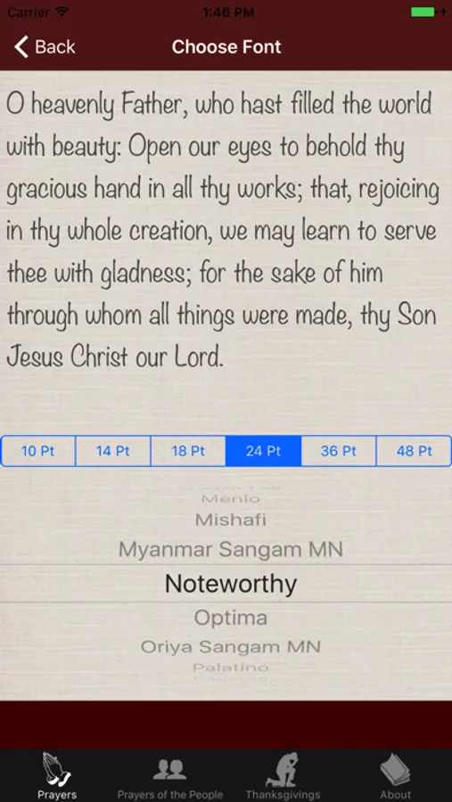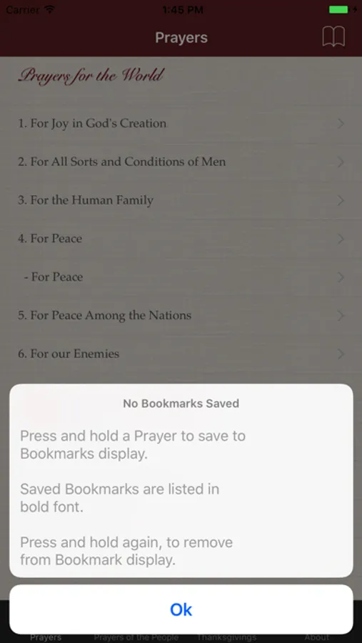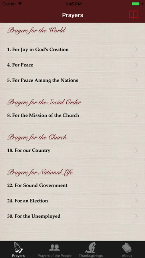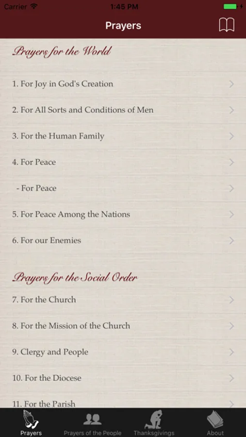 This App is based on the Prayers and Thanksgivings chapter in the 1979 Book of Common Prayer (Episcopal Church) beginning on page 809. The purpose of the App is to provide easy access to more than 120 Prayers and Thankgivings available using a simple to use interface. Also included is the Prayers of the People (Forms I through VI) normally found on page 383 of the 1979 Book of Common Prayer (Episcopal Church). I hope you and your family find this App spiritually enriching for your souls and enjoy it as much as I do with my family.