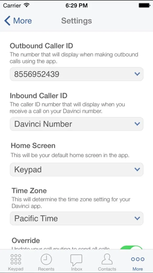 Note: No emergency calling (911) available using the Davinci Virtual Mobile Application.