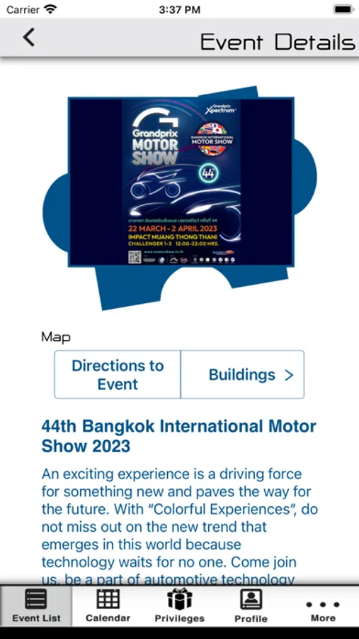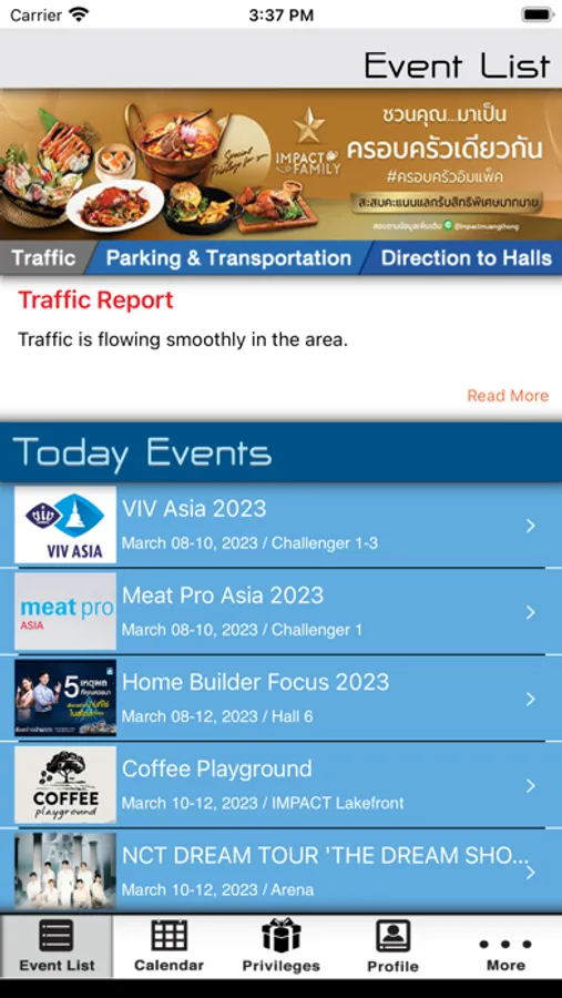 Conveniently, you can get today and upcoming events’ information i.e. dates, times, locations, ticket information and event’s organizer information. In addition, Google map with direction and buildings map are also available to simplify your commute and planning. Moreover, you can easily share event information with friends via email. Last but not least, you can also find promotions from IMPACT’s restaurants and event organizers within the app.