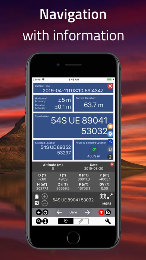 The app utilizes World Magnetic Model WMM 2015 and/or WMM 2015v2, and is able to compute geomagnetic-field values: i.e., magnetic declinations, intensity, magnetic grid variation, etc.