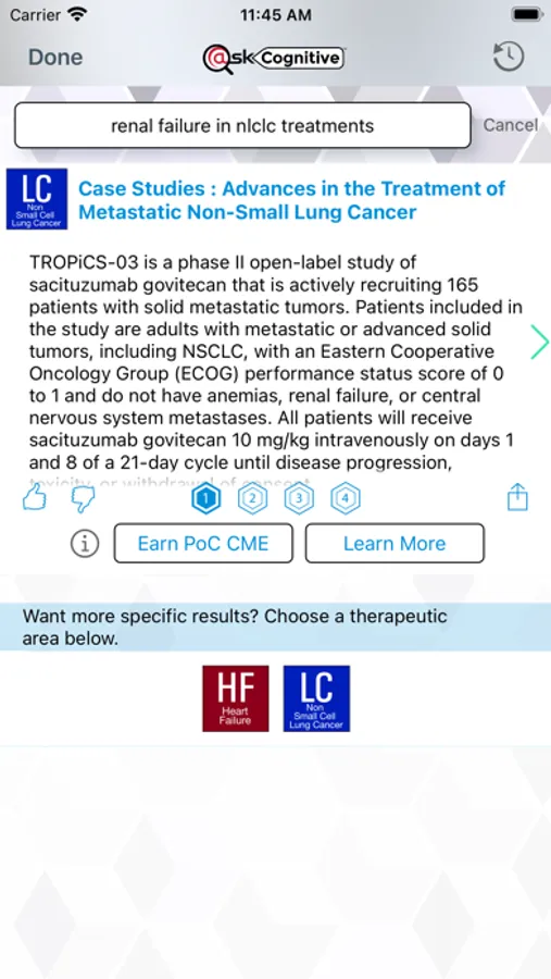 With @sk Cognitive AI, clinicians use @Point of Care™ to easily access curated, evidence-based, and disease-specific medical content. Clinicians navigate content by asking voice-enabled natural language questions. With Watson, confidence-rated answers to efficiently incorporate best treatment options happen more quickly and decisions are made faster to improve patient outcomes at the point of care.