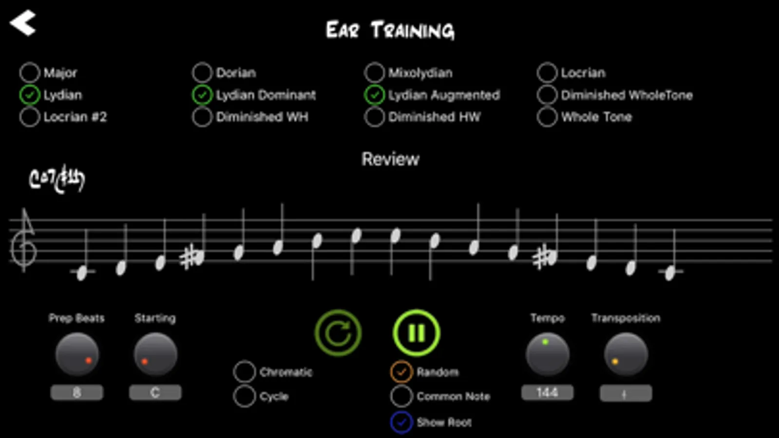 The ear training exercises are based on the incredible work of David Baker. We've "appified" his exercises so that you can configure which chord/scales to work on as well as other parameters. These exercises are one of the best methods to help you get your ears together!