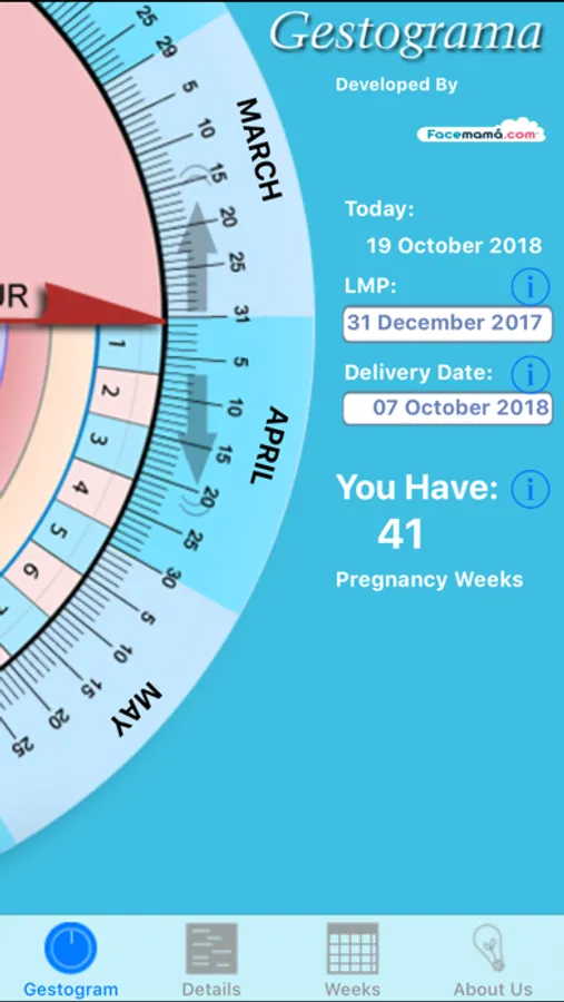 With this useful application you can get, within seconds and by only rotating the wheel until your last menstrual period (LMP), details of: