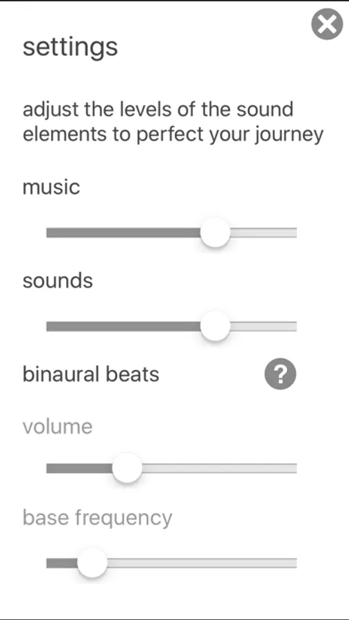 - Set the levels of the music, sounds and binaural beats to suit you