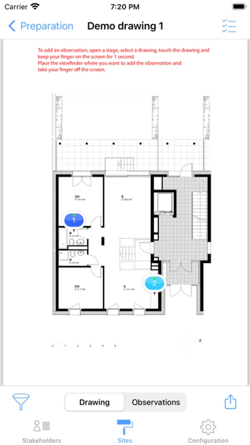 - Each site has its own original drawing library and a folder for any of your project building stages (freely customizable, example: "Preparation", "Supervision", "Handover") containing your drawings and observations (punch/snag list items) sorted hierarchically.