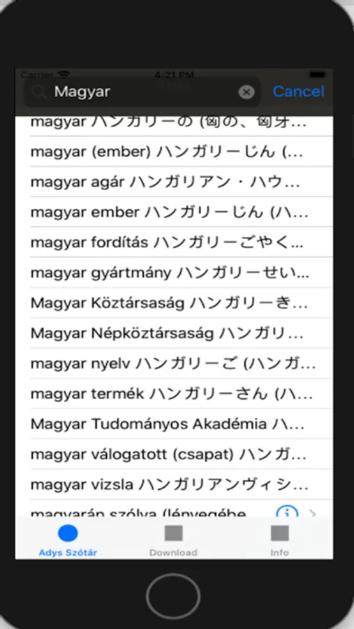 Offline Hungarian-Japanese Dictionary viewer. You can download 70,000 word dictionary via Internet without charge.