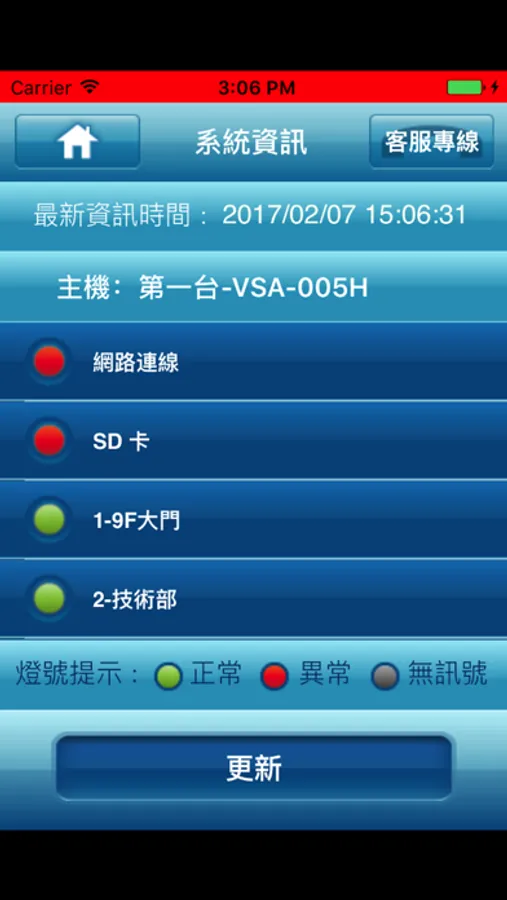 可取得目前影像主機之即時資訊,包含網路、SD卡及攝影機狀態。