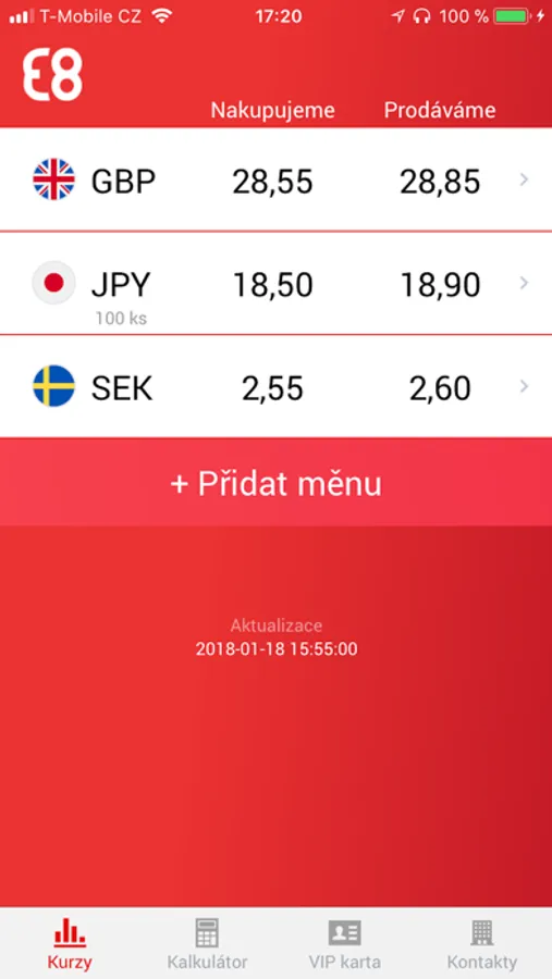 Aplikace, díky níž budete mít po ruce aktuální kurzovní lístek a převodník měn a hlídat změnu kurzů. Navíc s ní ve směnárně Exchange 8 v centru Prahy získáte výhodný VIP kurz. Stačí na obrazovce telefonu ukázat obsluze VIP kartu a máte ho.