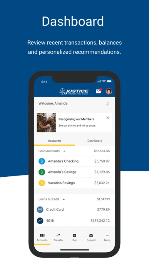 *There is no charge for Justice Federal Digital Banking, however message and data rates may apply. Such charges include those from your communications service provider. Delivery of alerts may be delayed for various reasons, including service outages affecting your phone, wireless or internet provider; technology failures; and system capacity limitations.