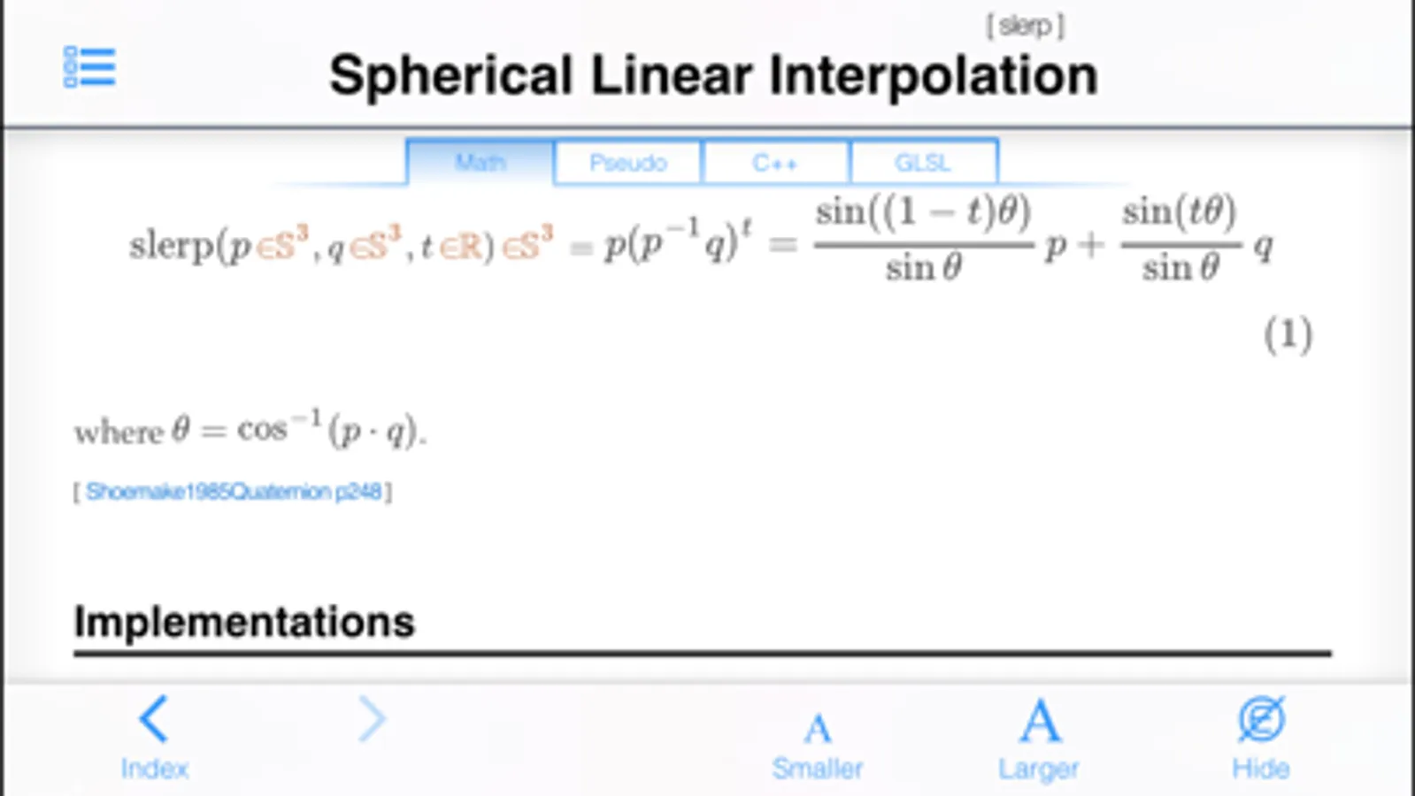 This app is a scholarly reference of equations, concepts, and notation employed in 3D computer graphics, supplemented by long-form chapters of lecture notes. It is designed for students, researchers, and industry practitioners.