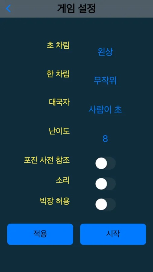 * 게임 도중에 대국자나 난이도를 바꿀 수 있습니다.
