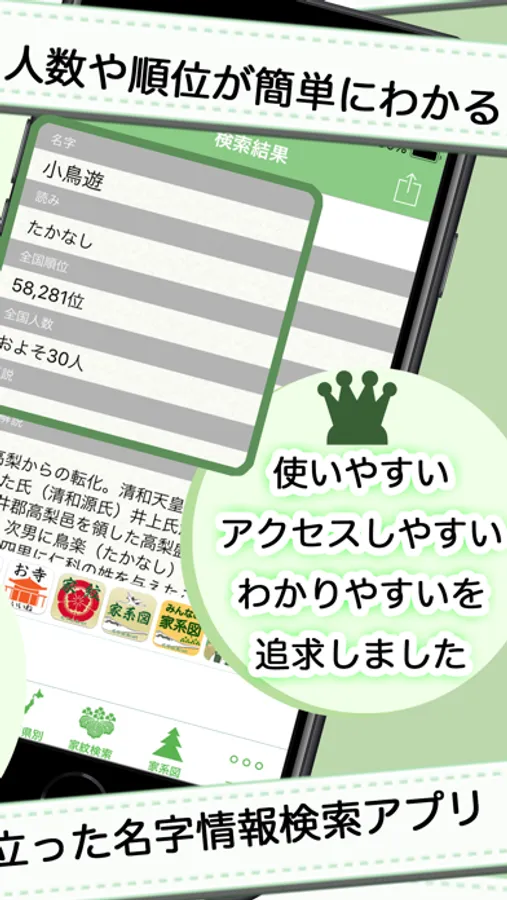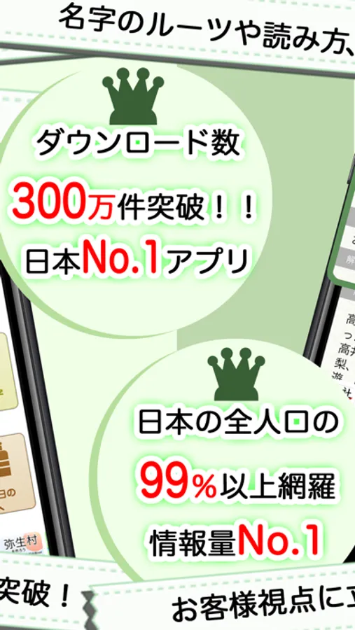 約30万件弱あるとされる名字において、名字由来netは日本の全人口の99.04%以上の名字を網羅し、「名字由来」における膨大な情報量を誇る「情報量No.1」アプリです。