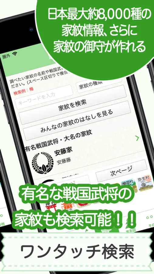 ・家紋検索機能では、家紋の特徴や戦国時代の有名武将・大名の名字で家紋の情報を調べることができる。
