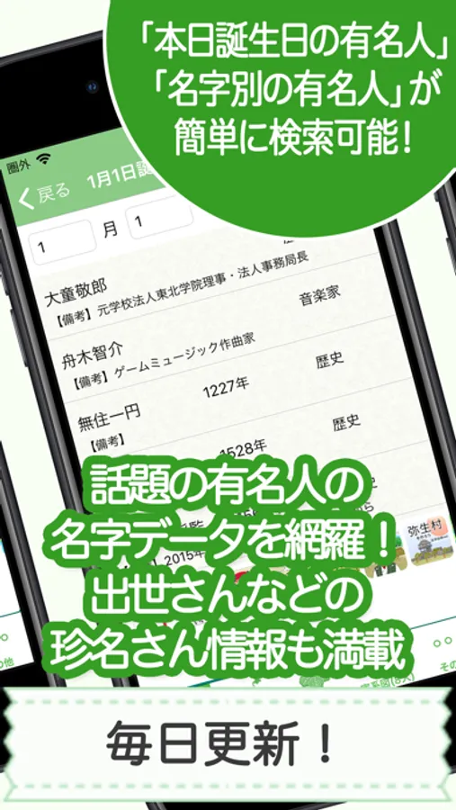 ・「本日誕生日の有名人」「名字別の有名人」が簡単に検索可能。