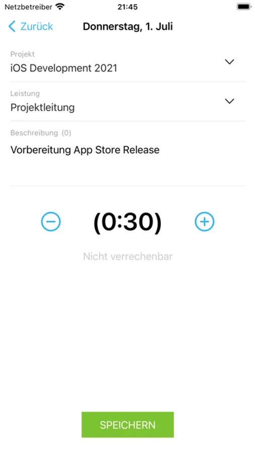 4. Eintrag: Projekt- und Leistungswahl, Beschreibung, Zeit und verrechenbar/nicht verrechenbar → Speichern