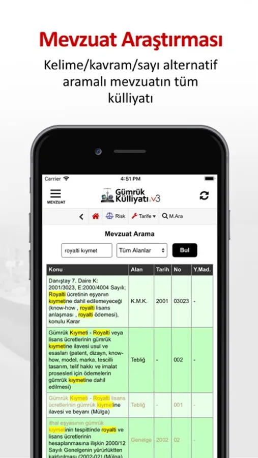 Gümrük Külliyatı: dış ticaret ve gümrük mevzuatına ilişkin Kanunlar, Kararnameler, Yönetmelikler, Tebliğler, Genelgeler ve Tasarruflu Yazıların madde ve ilgi bazında birbirine ilişkilendirilmiş; Tarife Cetveli, eşya fihristi ve BTB ler Risk Havuzuna entegre edilmiş; Mülga/Mer'i mevzuat tek elden işlenmiş; Karar Destek Sistemi oluşturularak kişisel risk hafızası oluşturulmuş; Mevzuat arama ile tüm mevzuat, güncelleme listeleri ile tüm değişimler v3 sürümü ile kullanıma sunulmuştur.