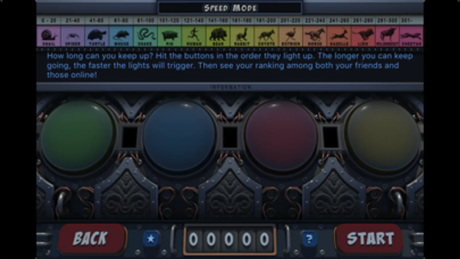 SPEED - Hit the buttons in the order they light up. The longer you can keep going, the faster the lights will trigger. How long can you keep up?