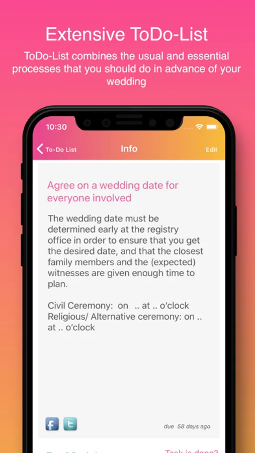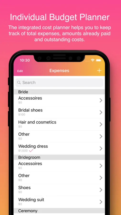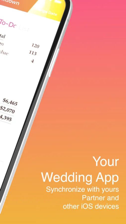 Based on the prospective date of the wedding day, the app calculates your personal wedding countdown and assists you in taking care of all upcoming tasks in a timely manner.