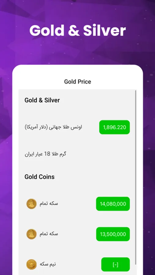 The latest Oil, Gold and other commodities prices are other information you will be updated everyday by using Mesghal App. These rates include: