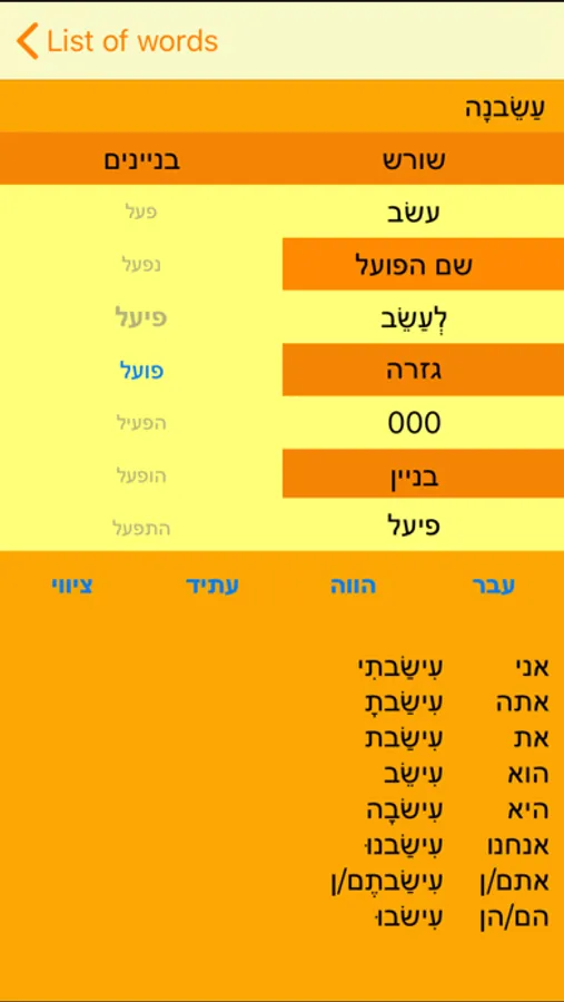 טבלת פעלים של השפה העברית, גרסת מובייל