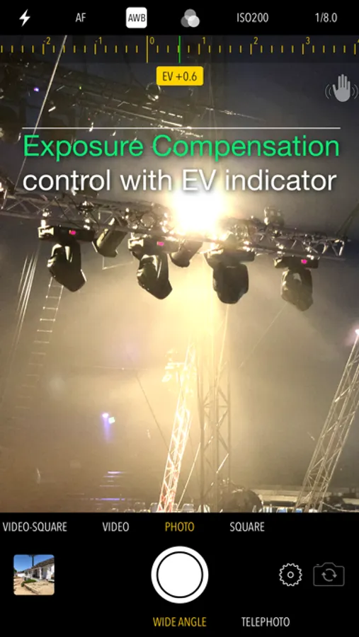 - Easy exposure compensation control with EV indicator. Just slide your finger up/down or right/left anywhere on the screen