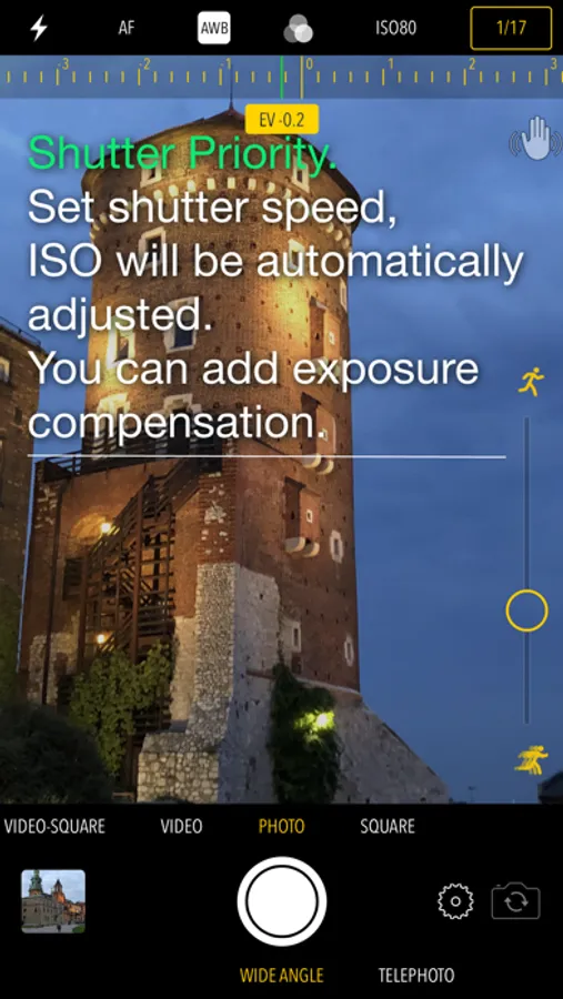 - Shutter Priority. Tap shutter speed indicator and use the slider to set the value, ISO will be automatically adjusted. You can add exposure compensation to it as well.