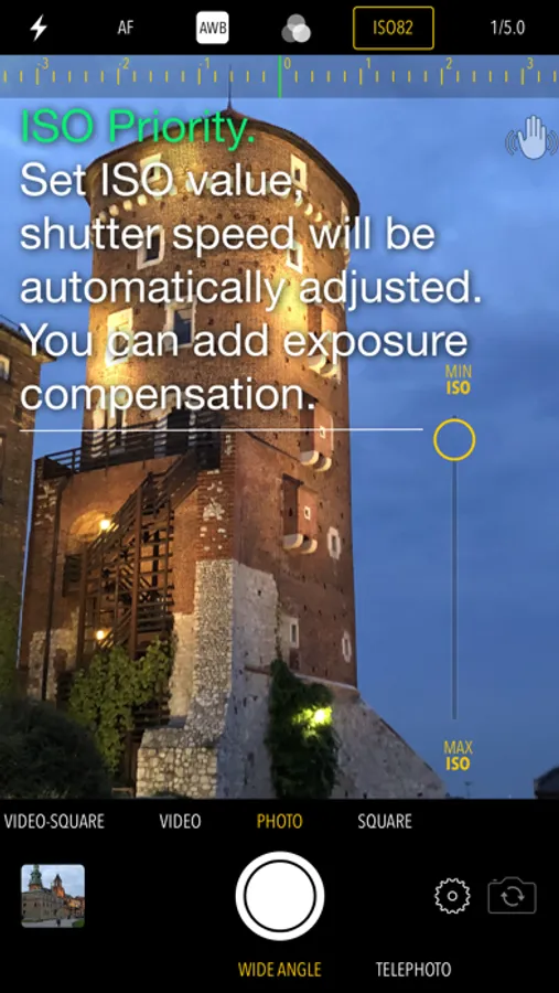 - ISO Priority. Tap ISO indicator and use the slider to set the value, shutter speed will be automatically adjusted. You can add exposure compensation to it as well.