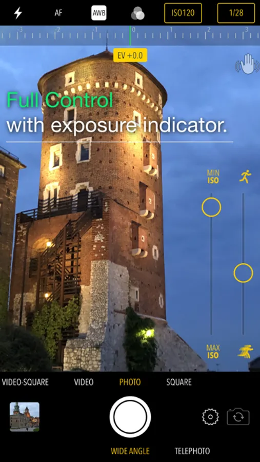 - Full Control. Select both shutter speed and ISO indicators, set the values with the sliders. Exposure indicator will tell you how well you are doing.