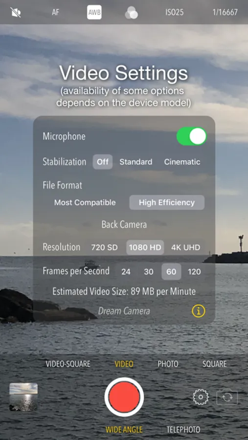 - File Format: Most Compatible (H.264), High Efficiency (HEVC-H.265) (if supported by the device)