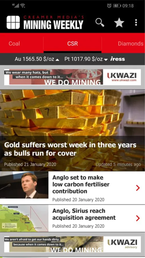 - Provides banner advertising. If you wish to place adverts on the Mining Weekly application, please contact advertising@creamermedia.co.za