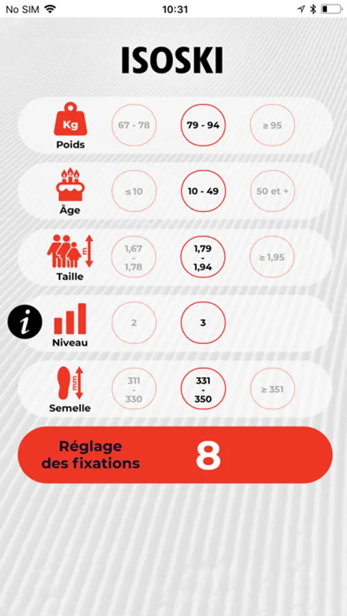 Isoski 3.0 permet de calculer le réglage des fixations de ski alpin selon la norme internationale ISO 11088.