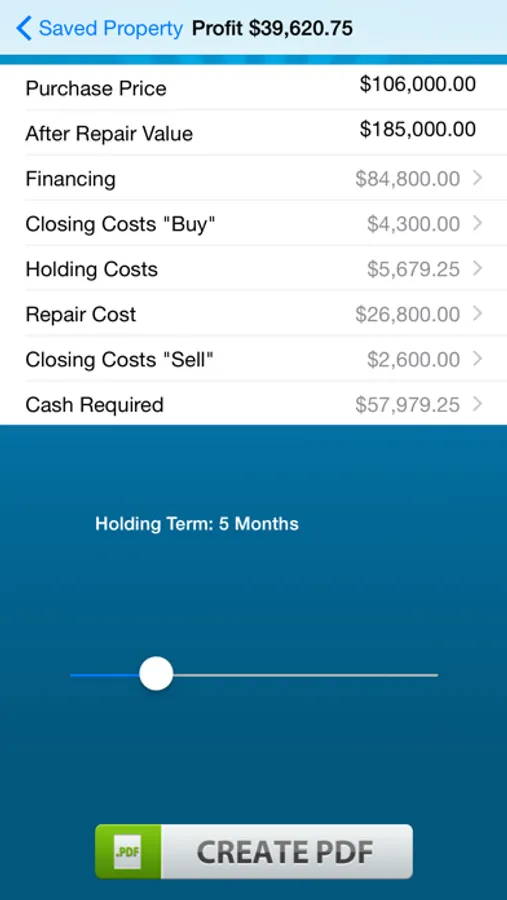 Create custom PDF reports which can be emailed, and calculate in detail all (Buy, Sell, Fix, Hold) expenses. (NOTE: Please set up email on your device prior to emailing PDF reports)