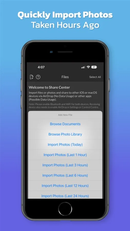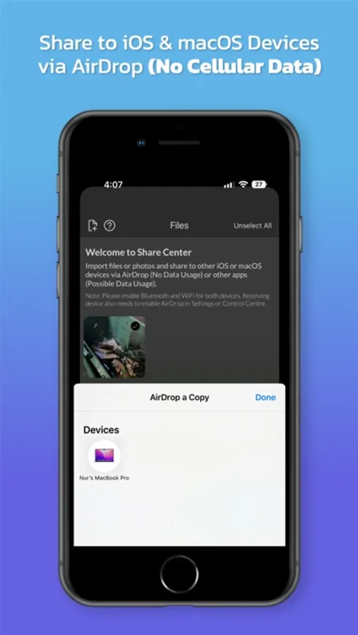 Uses the iOS AirDrop feature to transfer files quickly without cellular data usage.