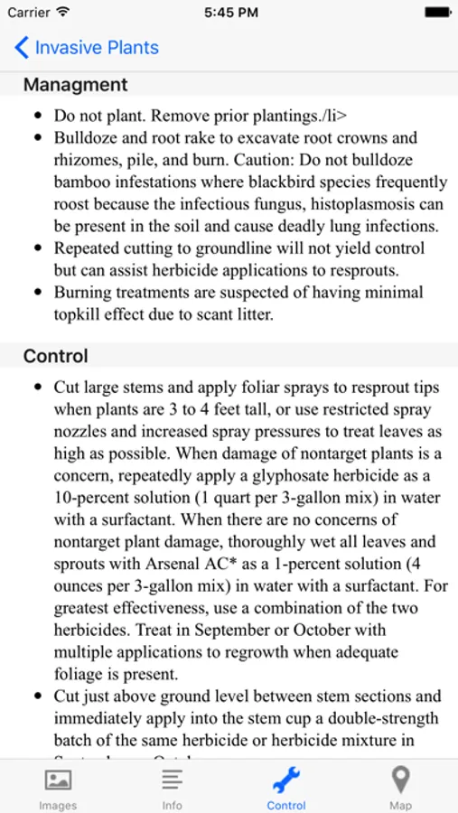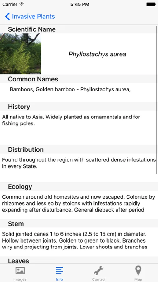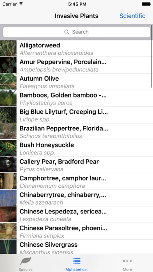 This app is based on the U.S. Forest Service publication: A Field Guide for the Identification of Invasive Plants in Southern Forests. Invasions of nonnative plants into forests of the Southern United States continue to go unchecked and only partially unmonitored. These infestations increasingly erode forest productivity, hindering forest use and management activities, and degrading diversity and wildlife habitat. Often called nonnative, exotic, nonindigenous, alien, or noxious weeds, they occur as trees, shrubs, vines, grasses, ferns, and forbs. This app provides information on accurate identification of the 56 nonnative plants and groups that are currently invading the forests of the 13 Southern States. Recommendations for prevention and control of these species is provided from the booklet, “A Management Guide for Invasive Plants of Southern Forests,” published by the Southern Research Station as a General Technical Report. Basic strategies for managing invasions on a specific site include maintaining forest vigor with minimal disturbance, constant surveillance and treatment of new unwanted arrivals, and finally, rehabilitation following eradication.