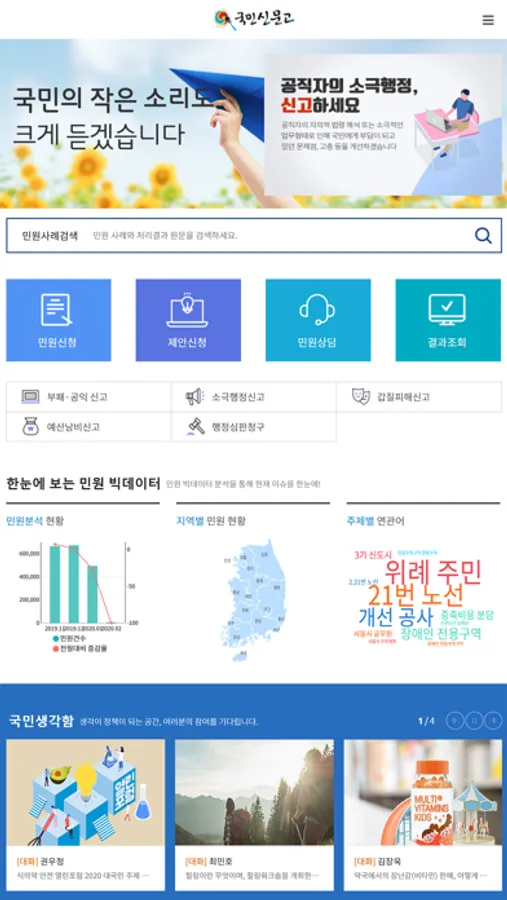 국민신문고 홈페이지를 통해 신청된 민원과 제안을 어플리케이션에 받아올 수 있는 기능을 제공합니다.