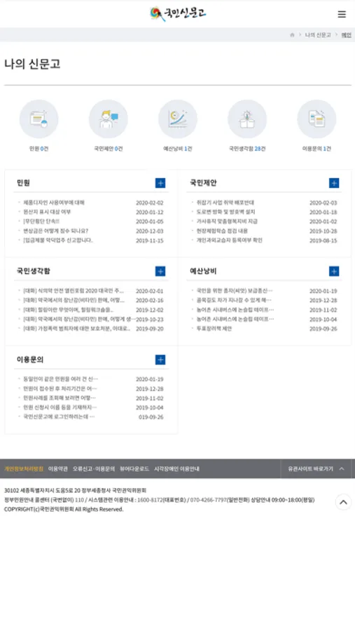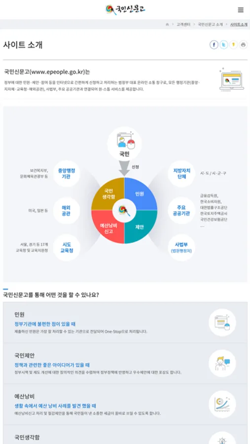 국민신문고는 정부에 대한 모든 민원, 국민제안, 정책토론 등을 신청할 수 있는 인터넷 국민소통 창구로, 전 행정기관(중앙부처, 지자체, 해외공관), 사법부 및 14개 주요 공공기관과 연결되어 있으며 국민권익위원회에서 운영하고 있습니다.