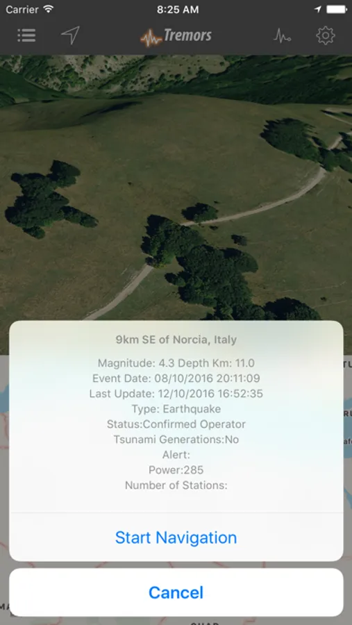 - Ability to start "Navigation" to the point of the earthquake